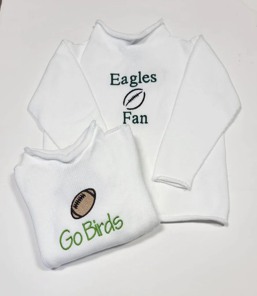 Our bestselling Jersey Rollneck Sweater is a versatile weight for year round wear. Parents love this long-lasting sweater because it washes beautifully and keeps its shape. Kids love this sweater because it pulls on easily and has no irritating side seams. Offered in an array of sizes and colors, perfect for family and sibling photos ops, especially with a custom monogram.