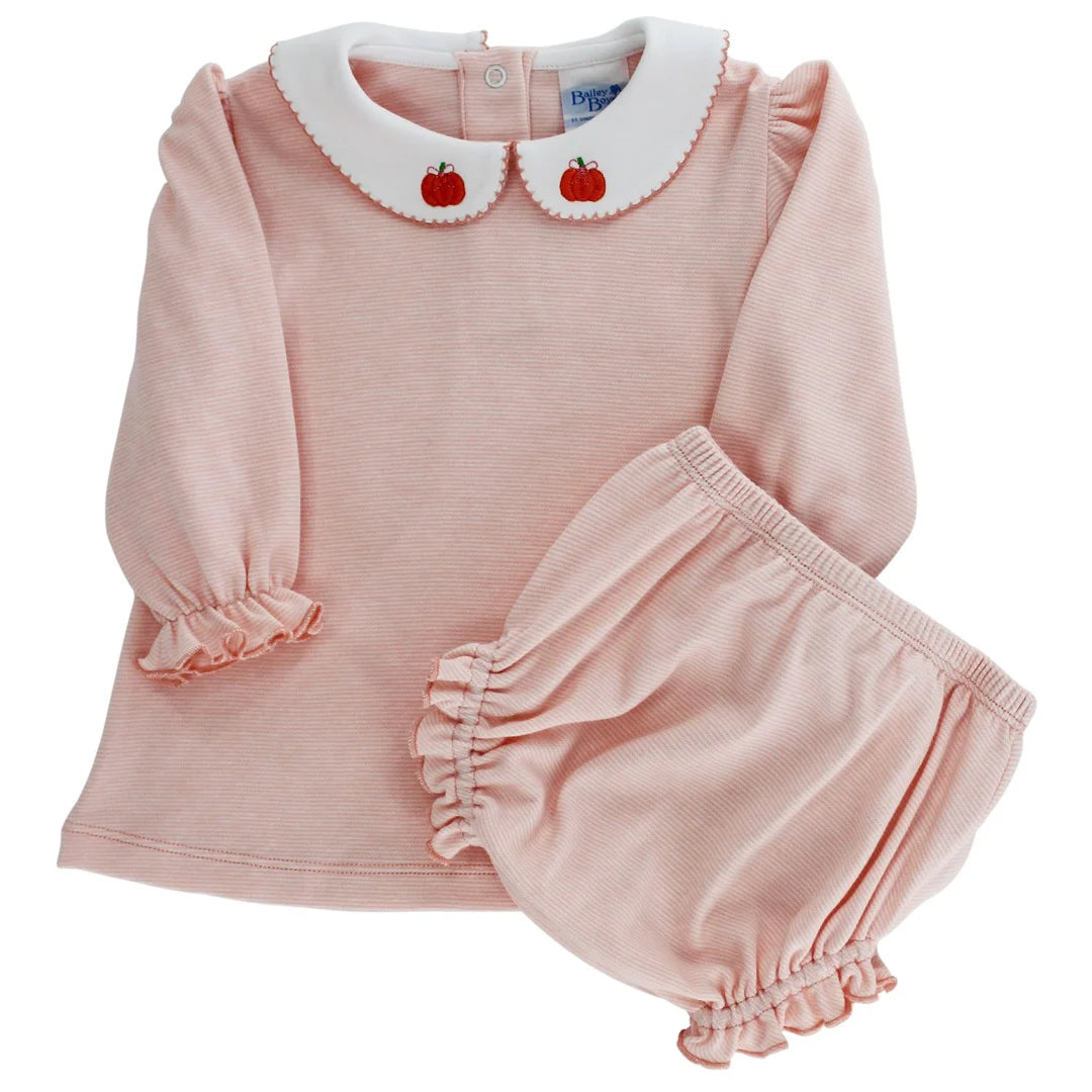 Celebrate the season in sweet style with the Pumpkin Diaper Cover Set for girls. This adorable fall outfit includes a long-sleeve top in soft pink stripes, complete with delicate ruffle cuffs and a charming white Peter Pan collar embroidered with tiny pumpkins. Made from cozy, breathable fabric, it offers both comfort and festive flair. The matching ruffled diaper cover adds an extra dose of cuteness while keeping your little one comfy and covered.