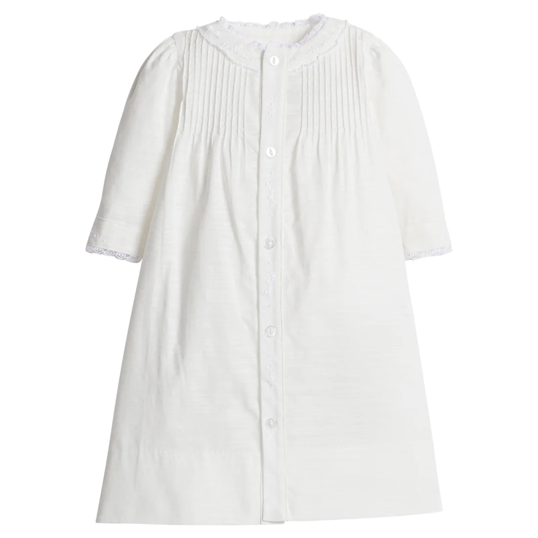 This soft, ivory gown features pintucks at the chest, delicate lace at the collar and cuffs, and finely embroidered floral vine detailing at the collar, cuffs, and down the placket.